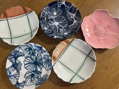 ピンクの花柄は、 某デパートの友の会を継続手続きした際いただきました。 2枚あったのですが、 いつのまにか1枚割れてしまったのでしょう。