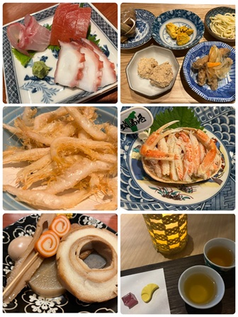そこは、金沢おでんとおばんざい酒場燦々というお店でした。 店内はお洒落ですが、老舗という感じではないし、ガラガラだったので、 ちょっと心配でしたが、食べ終わった時には大満足でした。 さすがにジュンちゃんはジュースにすると言い、あたしだけビール。 金沢おでん、刺身、5種のおばんざい、香箱ガニ、白エビの唐揚げを注文。 香箱ガニとは北陸地方などで獲れるズワイガニのメスのことで、 小ぶりですが、甲羅の「内子(うちこ)」と腹部の「外子(そとこ)」という2種類の卵、 そして濃厚なカニ味噌が特徴で、高級な冬の味覚として知られているそうで、 タクシーの運転手さんから、ここ1ヵ月しか食べられないからぜひと言われていました。 お品書きには時価とあり、店員さんに聞くと、今日は2,000円とのことなので、 ジュンちゃんと迷わず注文。 これがサイコーーーーーに美味しかったです。 白エビも昨日のより大きめで、さらに美味しく感じました。 2人で8,200円と妥当な感じでした。