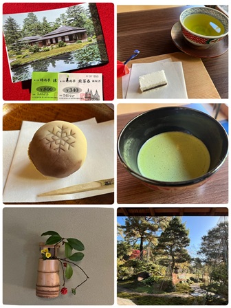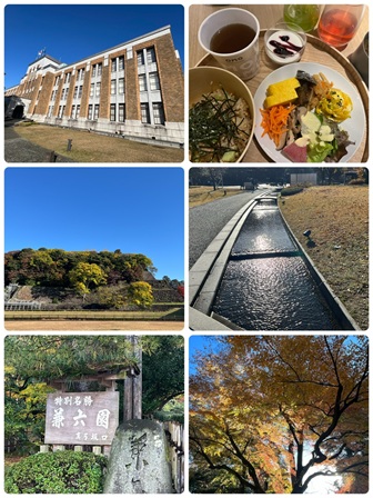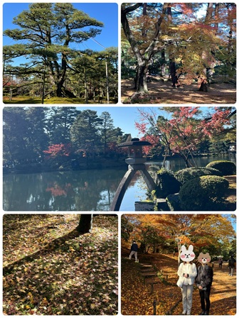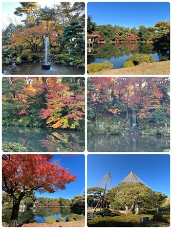 兼六園はもう見るものすべてにため息。 紅葉もいい感じに残っていたし、足元に落ち葉が敷き詰められていて、 全てのタイミングが良かった。 天気も最高で、池に映る紅葉も鮮明でした。 園内は若干勾配もありましたが、苦にならない程度。 1時間半ほど散策した後、あたしの希望で茶室へ。 抹茶と煎茶の両方を楽しみました。 茶菓子もお茶も茶室もお点前も、すべてが良すぎました。