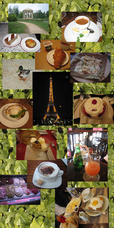 一応の解説。上の左から順に、プチ・トリアノンの庭・魚のスープ・モンマルトルのパティスリーのケーキ・朝ごはんのクロワッサン・そば粉クレープ・リュクサンブール公園の鴨(食ってません)・正時にキラキラ光るエッフェル塔と月・焼きアプリコットとバニラアイス・老舗カフェのアイス・ビストロのデザート・ペリエとグレープフルーツジュース・カフェアラクレーム・アイスアイスアイス!・オムレツとクロックマダム (これらはほんの一例です。)