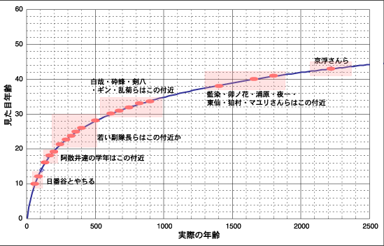 上の図は、私が勝手に設定した見た目年齢(下に詳細があります)と、それをプロットした、見た目年齢・実年齢グラフです。 見た目年齢は「だいたいこれくらい」で決めています。±3くらいはして下さって構いません。そうすると、実年齢にかなり大きな差ができますが、それくらい(?)は仕方ないと割り切ります。男らしくさくっと。 そして、この人はだいたいこの付近だろうなと考えてピンク色の領域を決めてあります。まあ、おおよその順番が決まればいいかなと思いまして、このようにしました。 プロットしてみて、だいたい、希望というか予想というか推測に合うようにできたようです。 それは何かと申しますと、隊長・副隊長クラスの死神は、数十年に一人現れる程度だろうという考えです。修兵と恋次達が近すぎ、かつ、同学年に三人も副隊長クラスが現れた恋次達が珍しいのではないかということです。 グラフを見ると、年長者になるにつれ間隔が広くなります。それは、まあ、それなりに死亡もしくは引退しているでしょうから、それも説明できます。 俺様な決め方をしたにしては、まあまあでした。