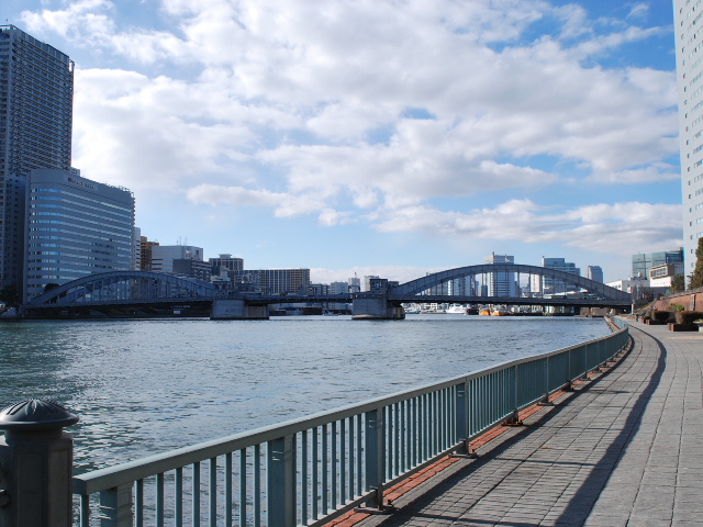 向こうに見えている橋が、勝鬨橋です。 勝どき橋は、月島から築地へとかかっている橋で 佃をうろうろするのがだいすきなわたしは、 何度もこの橋を渡っています。 昔は、跳ね橋だったそうで 橋の中央あたりに、それを操作する近代建築が残っていて とてもすきな橋です。