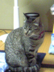 友人の家の愛猫(メス)  夏に来たので名前は「なつ」と言うらしい。 抱き上げた時にみせる、愛想の無い表情が堪らない。 「お前なんて、爪とぎ用の壁紙以下さー」と思っているに違いありません。