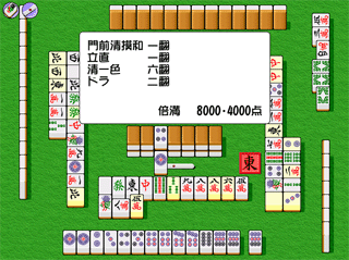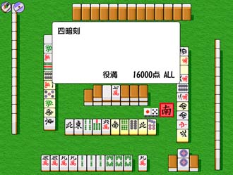 キタ、キタ!  でも、こういう1つの役で役満よりも、 ピンフとかイーペイコウとかタンヤオ、リーチ、メンゼン、イッパツで跳ねたりする方が嬉しかったりする...。