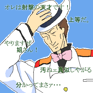 ナディアに出てくる、頼れるガンマン(でも、本職は運転手)  ハンドルを握ると一段とナルシスト度が上がります。 あっと、この人の言う姐さんは、もちろん少佐で!(で、機械オタクの相棒はボーマだ)