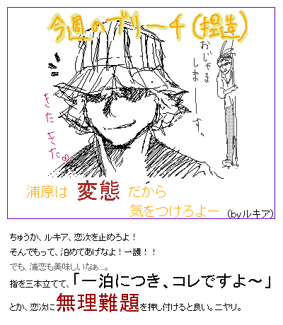 これはネタバレにもならないと思う。  この日記とかサイトの中身をよく知ったらっしゃる方はもう、分かりきっているかと思いますが、 こういうことを考えるのが好きです。あのメガネ、ダテなのかな(笑)。 あ、彼、ジャンプ本編では探しておりませんよ! ブリーチ。そういえば、このなかでは日番谷隊長が一番上司なのですね。...うーん難儀だ。乱菊姉さんが一番壊れていると思います(笑)。恋次はルキアのイラスト支持しているのか...、ただツッコミをしないだけなのか。 19巻の表紙が一護に戻ってて、とてもショックを受けました。ま、だ、イイキャラが残ってるよ!?