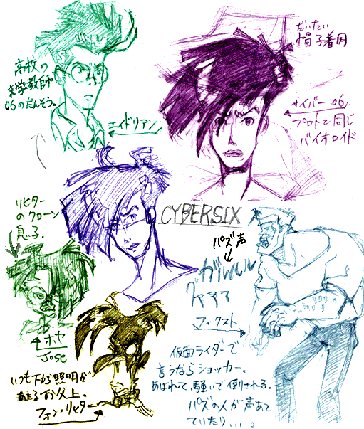 今、無性に見たいアニメ。サイバーシックス。 パズの人がチョイ役で出てます。と言っても、まともな日本語を喋ってはいなかったと思いますが(汗)。このアニメ、知っている人はいるのだろうか。5話の不良役では日本語喋っていたかもしれません。んー、覚えがない...。 上のサイトを見ていたら無性にラクガキしたくなって、模写模写。ちょっと重いかも知れません。 作中に右下の激しい逆三角形の体型のオッサン(人造人間、にあたるのか?)が何体も出てくるのですが、その声(というかうめき声)を小野塚さんがやってます。ボスの手下の手下なので、毎回サイバーシックスにやられて、蜘蛛を散らすように逃げていきます。 このアニメを見たのは高校生の頃、まだ、こっちの世界も知らなかった頃だと思います。男装したサイバーシックス(エイドリアン)とルーカスのやり取りにフツーにドキドキしてました(笑)。 なんていったて、ルーカスの声がよすぎです。ワタルの龍神丸。かっこえー。