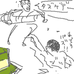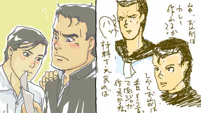 確か設定は、学園モノだった気がします。 ワライさんと学生or学園or生徒会(まぁ、なんともあやふやなテーマ/笑)で 艦長副長の4人を2人づつ撰ぶ阿弥陀くじをしたら、 きれいにやまと勢、たつなみ勢に分かれました(笑)。  左、深町の下駄箱に入っていた手紙を覗く速水。 右、カレーが食べたい海江田と昔のネタでゆすられる山中。 そして、今日の我が家のよるご飯はうどんと肉じゃが、その他おかず2〜3品だったのですが、母曰く最初は肉じゃがではなくてカレーの予定だったとか。「でも気がついたら肉じゃがの味付けになっていた」と母は言いました。 あぁ、なんてかぶりよう!!さすがは親子と言うべきか...。