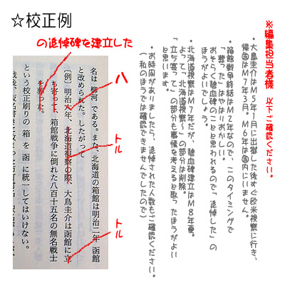 で、あんまり切なかったんで、やってみました。校正実地訓練。(笑)→コチラ。 人数の部分も確実ではないはずなので訂正したいところですが、「校正者はでしゃばりすぎてはならない」という黄金律がございますので、メモで編集者に注意を喚起する程度で。