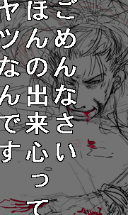 なんつーか、むしゃくしゃしてこういう絵は描けないので(余計落ち込むから)多分ノリノリで描いてたんだと思います。何で途中で泊まってるんだっけ、、、、陣羽織どうしようか悩んだのかな、、、っつーか別の意味で十八禁頁作るつもりだったのか私。腕吹っ飛ばされるのもそれはそれでとても辛いけど、こう端から少しずつ刻まれるのも勘弁だなぁ。とか考えながら。大体指先の神経滅茶苦茶集まってるからちょっと切っただけでももっそいイタイですよねそれを延々ってどんな苦痛。、、、たぶんあれだ、自分が職場で爪ごと指先削いだときにそんなことつらつら考えてたらこうなったんだきっと。、、、、あーまぁ、今は両手腕火傷だらけですけどね!(どうでも良い話)