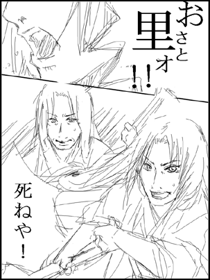 またぞろ話題があさっての方向へ飛びますが、この間初めてバサラサーチさんの絵茶にカチコミ掛けてきたんですが(妙に絵茶したかったんですよどうしてもね!!)(なんか妙に人が一杯だったので、カップリング話禁止板の方にお邪魔しました)もっそい素敵な絵を描かれる方とご一緒できました。いやもう、なんだこの人とか思った!目の前でどんどん姿を現すさちむらとかはたけのおっさんとか見て!そして話がシンクロしまくりで大変楽しかったです(笑)その節はありがとう御座いました>凸さん(仮名)