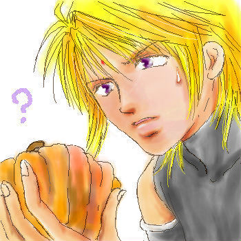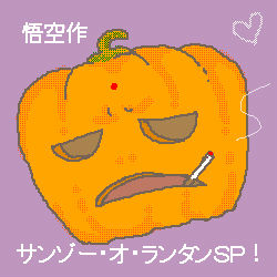 ![]() 出来上がったジャック・オ・ランタンを寝所の居間の食卓の上に置いておいた。 笙玄に言われて、失敗したカボチャの残骸を集めて、カボチャの中身と皮付きのとを分けた。 「中身の実はお菓子やスープにしましょうね」 そう言って、笙玄は黄色いカボチャの中身をいくつかに小分けして袋詰めした。 「こっちは寺院の厨房で処理してもらいましょう」 って、大きな袋にひとまとめにして。 笙玄と一緒に寺院の厨房へ持って行った。 戻れば、部屋に八戒と悟浄がいて、 「悟空、上手くできましたね」 「なかなかの出来じゃん?」 そう言って、褒めてくれた。 そして、 「ちょっといいですか?」 って、八戒が俺の作ったジャック・オ・ランタンの額に赤いマジックで三蔵のチャクラと同じものを書き込んだ。 それを見ていた悟浄が、笙玄に何か囁いて、笙玄がにこにこと頷いて…。 「こうすっと、そっくりだぜ」 って、笑った。 何がそっくりなのかって、ジャック・オ・ランタンの前に行ったら、そこに三蔵が居た。 「このたれ目具合と言い、この眉間の皺といい、そっくりですよ」 「ああ、ホント、ホント」 顔を見合わせて八戒と悟浄が、笙玄までが頷くから。 「べ、べつに三蔵を意識した訳じゃないかんな」 って、言い訳したら、三人に頭を撫でくられた。 その日の夜、仕事から戻った三蔵がそのジャック・オ・ランタンを見てものすごーく嫌そうな顔をしてた。 (悟 空/illust by みつまめ様)