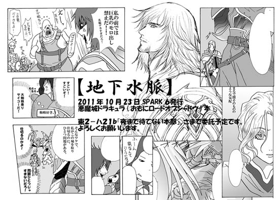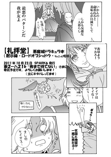 コミケ 1日目(木) 西の−09b〜 - 2011年10月31日(月) 万聖節ですね〜 月が弓のようで、なかなか雰囲気のある夜ですね〜 取り敢えず冬のコミックマーケット受かりました〜^^ 初のモンハン参加です〜☆ あ〜…受からないと思ってたYO☆ 一日目(木曜日) 西地区 の−09b 「バーで戦え!」 モンスターハンターP3rdスペースです^^ ガンナー(ライトボウガン)と剣士(太刀)コンビの本とか。(合同誌) アドホックパーティでのプレイ日記的ななにかも出るといいな〜。。。 なんて、モンハン関係のどこにもまだリンクしてないのですが^^; 駄目駄目だ〜!! ![]() ハンマーをレッドビートから、星砕きプロメテオルに強化させた記念に 描いた落書き^^;すべての装備が初書きだ〜(;´Д`) もう銀レウス装備ばっかり。 ガンランスを奨められてやっぱ銀レウスで作りましたが、狩猟仲間を 竜撃砲で一撃死させてから封印中。。。 ルリコシボタンインコのもぐらちゃんが行方不明になって丸一年が 経ってしまったんですね。。。 元気にしてるのか〜もぐら〜!!! - 悪魔城 ガブリエル×ローラ 公式か〜!!? - 2011年10月30日(日) なんだかんだで淡海さまから情報を頂きまして、 なななななんと〜… 海外版ではダウンロードコンテンツで、ローラを助けに悪魔城へ 乗り込んだガブリエルが、二人で協力プレイしながら戦うような ゲームがあるそうですよ〜〜〜〜〜〜〜〜〜〜!!!!!!!! はやく日本でも発売してくれ〜〜〜〜〜〜〜〜〜〜〜〜!!! と、世界のとっても片隅で、叫びまくってみる(;´Д`) 公式じゃねぇか。。。公式だよ。。。だからローラのその後が うやむやになっていやがったのか! あああああ遊ばせてくれ〜〜〜 でも今年中は忙しいので、来年あたりに発売してくれ〜←おい だって…モンハン原稿しなきゃならない時に、発売されたら酷ですよ? ってゆーか、冬の当落通知って、分かり始めてるみたいですね〜 …おいらはまだ…良く分かってません。 郵送されてくるまで待つのみですわ〜ん☆ うーん。最近物事が上手くまとめられなかったり。。。 …運動するか。 頭の血の巡りが悪いのかもしらん。 モンハンではガンナーやってますが、今度は現実で弓やってくるかな〜 …でもあれ、一回眼鏡を吹っ飛ばしてから、ちょっと首が、矢を放つ瞬間 逃げちゃってしょうがない。。。 頭二人がかりで押さえつけられても、弦から瞬間放しちゃうです。。。 人間の首の力って、結構あるもんなんですね。。。 ちなみに和弓ww アーチェリーは、弓おく場所があるから詰まらん(´Д`) =3 本当はその方が狙いやすいんでしょうけれどね〜 弓の人が、上に向かって矢を放つ姿は、気持ち良さそうだ〜 - 悪魔城プチオンリーお疲れさまでした〜^^ - 2011年10月28日(金) 参加した皆様、お疲れさまでした〜! といっても委託参加なので、寂しい梶川です>< 自分も本GETしたかったよ〜!! でもアンソロだけGETしましたよ〜!! 他…他のも欲しいんですけど… 通販とか…出来るのかなぁ(ハァハァ←危ない人になってきた 本を買って下さった方々、有難う御座いました〜^^ プチオンリーなのにネタバレ本ばっかりでゴメンナサイ! ギリギリまでネタバレ自粛して一冊落とすか迷ったんですが、 ガブリエル×ローラをなんとか布教?したいと、出しちゃいました。。。 2冊ともネタバレ本で読者に優しくないものになりましたね。。。 書き始めたら…ガブリエル×ローラになっちゃって><; 今にローラが出てくるシリーズが発売されるといいな〜と密かに 呟いてみる。。。 最近黙示録マルスとガブリエルの関係で(知ってる人だけ察して下さい) ちょっと萌入ってますが。。。 早く続きを…シリーズの続きをお願いします、コ●ミ!! …まあ気長に待てるたちですけどねww - しろしろ - 2011年10月26日(水) 削除ってみました^^ - 23日 SPARK6 悪魔城本新刊的な - 2011年10月19日(水) ![]() 黙示録、ロードオブシャドウ、闇の呪印他好きモンスターとか? ![]() ロードオブシャドウを主に。 ガブリエル×ローラな感じです。 反動で悪魔城のゲームやり直しちゃいそうです。 でもソフトが見付かりません。 …どうしてなんだろう。。。 いくつか買い直しましたが。 お気に入りほど見付からない。 あまりに綺麗に見付からないので、まとめてどこかにある気がする。 ってゆーか、竜が如くのおまけDVDはあるのに、ソフトがねぇ!(;´Д`) …そこまでブラックホールな部屋ではないつもりなんですが… たった二部屋で、一体どこへ消えるというのか。。。 今回の反省。 全体的に中途半端。 やっぱギャグに絞るべきだったなぁとか(;´Д`) シリアスっぽいのはネーム描いても全部没ってきたので、 今回25周年の記念に恥さらしてみた。若干死にたい。 最後まで話終わってないし。中途半端だし。 黙示録は以前の無料配布本に毛が生えた感じで…前の方がギャグに 絞った分まとまってた気がする(−−; というか、やっぱりゲームプレイ日記的なギャグのが自分的に好きなので 納得いってナイ感じ。。。 没るかどうかを悩んで、結局2