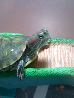 うちのガメ子です。7月末にお祭りに行った時に出店で金魚釣りでないカメ釣りがあってそこで私の側に来た子です。