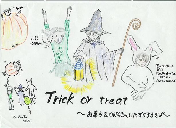 ハロウィンということで、絵描いてみました。色鉛筆でぬって、スキャナで取り込んだのですが、なんかまわりにフチができてしまった。気にしない、気にしない。。