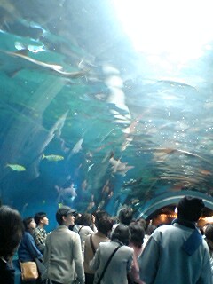 2階に上がると水族館受付入口、入るとすぐドーム型の水槽があり、たくさんのサメやエイなどが泳いでいる。大きなサメなどが頭上を通るのはすごい迫力だ。