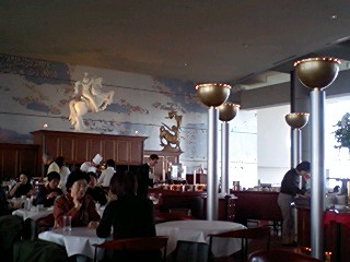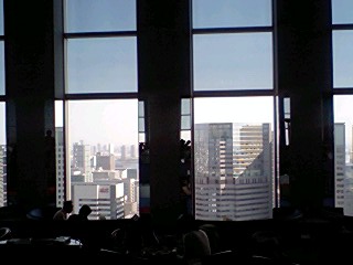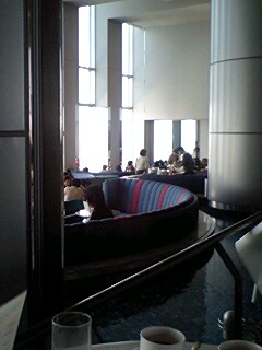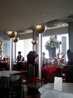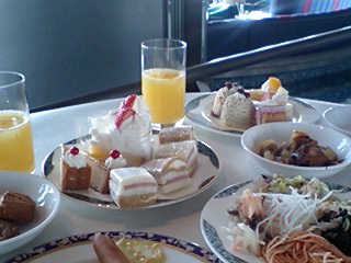 場所は品川プリンスホテル38F“トップオブシナガワ”ランチブッフェ 何日か前に予約をしようと電話をかけたら予約はもういっぱいということで、“当日席はたくさんご用意していますので11時頃来ていただければ大丈夫です”と言われたので、その時間頃に到着、予約の方から店内に入っていき、景色の良い窓際はとられてしまっている。しかし私達の席はケーキコーナーのすぐ近く!おおう、いいぞ、いいぞぅ♪♪ でも今度は絶対早く予約の連絡して窓際をとるぞ!
