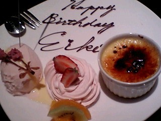 今日はなぜ1日仕事を休まなかったのかというと夜に食事会があったので。夜だけ参加するのもちょっと嫌だったので午後から出勤、仕事終了後、新しく入った方達との顔合わせということで、洋食屋さんへ。。。 美味しい料理を食べて、さぁ、デザートというとき、お皿に花火をつけてお店の人が私の前に置いて、“おめでとうございま〜す”と拍手してくれました。 何?何?と思ってデザート皿を見てみると、そこには“Happy Birthday ○○・・(私の名前、さて何でしょう)sama”とチョコペンで書かれた文字が・・・ そうだ、うちの部屋では誕生日のお祝いにケーキを買ってきてくれたりしてお祝いするのですが、3月は私も休みが多かったし、仕事も忙しかったのでやらずじまいだった。4月の誕生日の方と一緒に私もお祝いしてもらいました。うれしかった、ほんとうれしかった。藤くんの誕生日の日に私も仕事場の人たちから祝ってもらってうるうるしそうになっちゃったよ。
