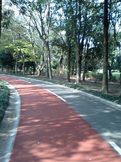 赤い道路がマラソンやウォーキング用、少し柔らかい素材でできている道路なの。