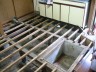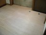合板製のフロア材はそうとうにフケていて、剥がす ことはいたって容易でした。築年数に応じた老朽を 感じました。が、下地の垂木は案外に腐っておらず、 これはそのまま使ってしまおうと思います。計画で は、この根太の上に厚手の合板を貼り込んで、その 上にクッションフロアを糊貼りします。