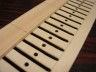 軽くて薄くて加工が容易で値段が安いと なるとベニヤが適しています。5mm間隔 で穴と切れ目を交互に作り、糸を通して これを上げ下げすることで縦糸をさばく 仕組みです。加えて織った横糸を締める 『おさ』 の役割も兼ねています。 何かの本で見たことがあったものを思いだしだし作ってみましたが、 まあまあ使えそうです。ささくれないように縦に切込みを入れるのに 苦心しました。鋸では幅が狭い、電動の丸ノコでは割れてしまう、 そこで行きついた手が、木工ではおよそ使わない道具の使用です がこれが良い按配にほどよい間隔の幅の切り込みが可能でした。