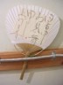 エアコンの届かない芋乃市場のトイレ は今年も暑い状況です。昨年は、三平 師匠のキャラクターを墨書した詫び状 を貼りました。今年は詫びだけでなく、 団扇を設置しました。ご来店の皆様に はどうぞご自由にお使い願います。
