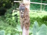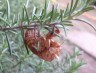 8月になって急に蝉の声が多くな りました。暑くなって慌てて羽化 したものでしょうか、あちこちに 脱け殻が見受けられます。木の 幹にがっしりとついたもの、網戸 にくっついたもの、一輪車のタイヤ などにもくっついているのを見つけると、微笑ましいよう な、猛々しいような、虫たちの生きざまを垣間見るようで、 心は波立ちます。画像のように、こんなに頼りないハーブ の枝にも、その脱け殻を見つけると、蝉の短い地上での 暮らしに激励の気持ちが湧きます。
