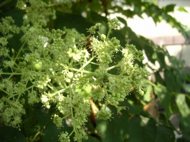 タラの木の花が満開になると毎年 どこからか蜜蜂が沢山やってきて 蜜を集めています。おとなしい蜂 なので刺される心配は低く、蜜を 集めるのに夢中になっているので カメラを近付けても平気です。 ニホンミツバチだといいなあとよく観察をして調べてみ ましたがセイヨウミツバチとの差がわかりにくく、じぇん じぇん識別が出来ません。セイヨウなら、どこかで養蜂 をしている方がいるのか、はたまたニホンミツバチなら 自然の群なのかとても気になるところです。ともあれ、 せっせと蜜を集める蜂の群のブンブン飛び交うさまは実 に楽しげです。それによって受粉する植物も、しめしめと 喜んでいるようで自然界の利害のバランスを嬉しく観察 しています。