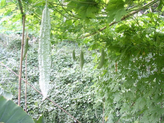 8月半ばに実を付け始めたゴーヤー は、この暑さに我が意を得たりと ばかり良く生って、ぶらぶらと棚 に下がっています。こういったもの はそうそう毎日食べるものでもない ので少々持て余していますが、好き な人にはどんどん差し上げています。陽気のせいで野菜 が少々高いせいか皆さん喜んで持っていってくれます。