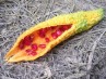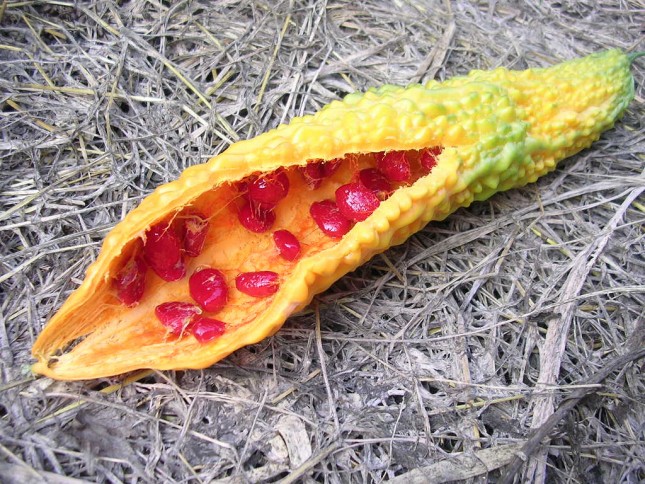 でもやっと、夏が終わりそうです。 今月も半ばなのに、9月2日ぐらい の気分です。ゴーヤーの実も黄色 く熟して良い種が採れそうです。 種は赤い果肉に包まれていて、この 果肉は甘いのだそうですが、キビが 悪くてとても口にしてみる気にはなれません。植物は全般 種が果肉に覆われていますが、これは次の年まで発芽しな いようにする役割もあるのだそうです。色が濃くて甘いの は、鳥や動物に食べてもらって種子を広範囲に拡げて蒔く 知恵なのだそうです。移動できない植物の、生物としての 巧妙な仕掛けが、実と種には込められているのですねぇ。