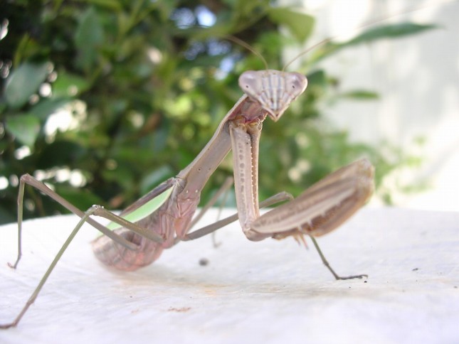 これは多分オオカマキリでしょう。 かなりカメラを近付けて撮りまし たが微動だにせず、グッと睨みつ けるような鼻っ柱の強い面構えで す。 『おおっ、やんのか?コラァ』 ってな台詞が似合いそうです。
