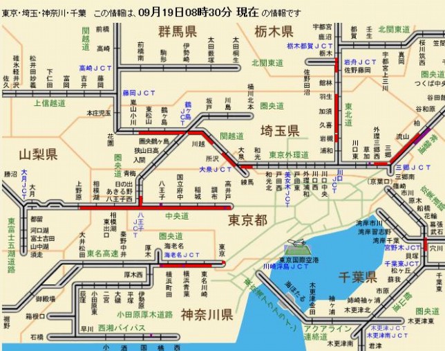 只今、夕方6時前、道路情報を見ると東名、中央、関越、 東北、アクアラインと、行楽帰りの激しい渋滞で地図は まっ赤っ赤です。遊んで疲れた体にこの渋滞はきつい ことでしょう。お父さん、お母さん、かんばって下さい。 くれぐれもイライラせず、安全運転で参りましょう。