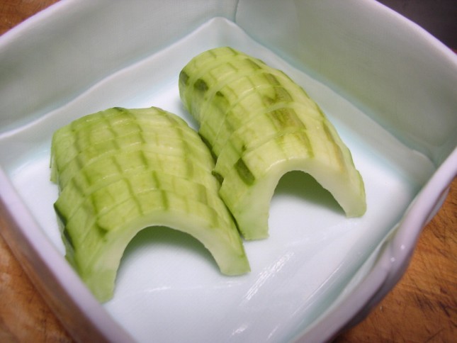 あまりここらで見かけない瓜で したが、イノシシの子供の異名 ウリボーはこの瓜からの命名か と思われる愛嬌たっぷりの姿は 好ましく、漬けるために皮をむ いて種を取ると、しっとりとした 果肉がいかにも美味そうで、漬ける前から期待が膨ら みました。漬け上がった物は関東の白瓜よりパリッと した食感で、心持ちぬるっとした舌触りが心地よく、 酒の肴に、又ご飯のおかずにピッタリの一品です。