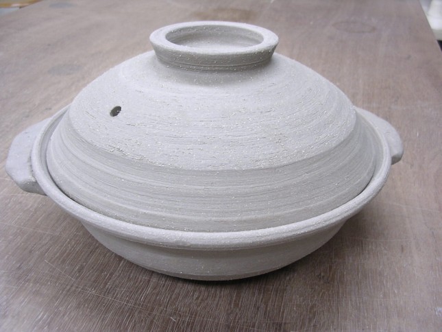 高温焼成ができそうな土での試作土鍋を作りました。 ろくろを挽いたのは先週のことですが、削り仕上げを して、手をつけて、蓋に孔を開けて、納まりを見て、 成形は完成です。