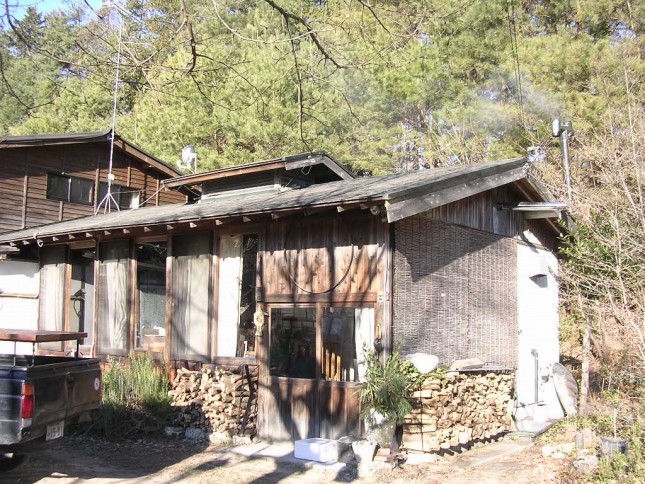 キンタさんのお宅は益子町の中心 から少々東へ行った田園地帯の小山 の中腹にあります。広い敷地に自宅 と工房が棟違いで立ち、様様な素材 に向きあっておおらかな造形活動を していらしゃいます。木、鉄、陶土など それぞれの言い分をきちんと聞き取り、自分の表現に必要な 加工を施すお手並みは見事で、どの素材も生き生きとキンタ さんの一分身となって存在感を放つのは天賦の才でしょう。 知り合って間もない20代の頃はその姿に憧れてせっせと真似 をしてみましたが、所詮メッキはメッキで地金に実力の無い 者にできる芸当ではなく、只の模倣はやめました。今はその 生き様から学ばせてもらっています。 薪ストーブの煙が立ちのぼる玄関