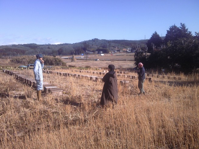 薪のストーブにあたりながら美酒に 酔い、最近興味を抱いている養蜂に ついて本職の方からお話を伺い、 あったけぇ布団で休ませていただき、 帰省する気分というのはこういうもの かと擬似 『故郷でのお正月』 を味わ いました。6日には諏訪さんの蜂場を見学させていただき、更に 詳しく教えていただきました。画像の巣箱は相当数があるように 見えますがこれはほんの一部で、自宅他各所に述べ数百箱が あるそうです。ひとつの箱には多い時で万を超える蜂が住む そうですから、その数たるや大軍団です。凄い仕事があるもの だと驚きつつ、諏訪さんは脱サラで始めて3年目と聞き、更に ぶったまげました。いつかウチでも少数の群れでいいですから 飼ってみたいものです。 小春日和の蜂場 左から諏訪さん、市場女将、キンタさん