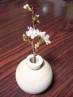 外側は無釉の焼締めで、型で作られ たらしい丸い形が愛嬌があります。中 を覗くと釉が施してあり、火薬が湿気 らないようにしたものでしょうか。厚み があるのでしょう、ずっしりと持ち重り するのが武器としての必然であるの か少々不気味です。口辺もがちっとし た厚みが付けられています。そのもの をそのまま写真に撮るのはどうかと思い、寒桜を投げ 入れてみました。一輪差しとしては中々良い感じです。
