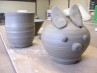 園児さんたちには自由に作って もらいますが、最後にろくろでの 成形を実演して、見てもらいます。 毎年お湯呑みやお茶碗を作りま すが、みんなのリクエストにお答 えして即興で作ることもします。 これまでに、アイスクリームやアンパンマンを作りました。 今年のお題は 『ウサギ』 難題でしたが、袋状に挽いた 胴体に耳と目鼻をくっつけてどうにか凌ぎました。でも、 じぇんじぇん可愛くありません・・・みんなの前では笑って ごまかしましたが、削り仕上げをして焼くまでにどうにか もう少しかわいくしようと思います。お届けは3月の卒園 式、時間に余裕はありますので、知恵を絞りましょう。