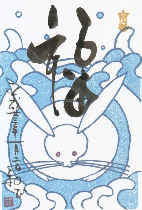 今年最初の 『芋乃市場』 の案内状 を本日、発送いたしました。お近くの 方は明日にもお手元に届くでしょう。 お正月に書初めした波に兎の福札を 写真面に配しました。染め付け風の 色使いが心持ち寒々しい色合いでは ありますがキラリと朱に光るウサギ の目玉がそれを補っておりましょう。