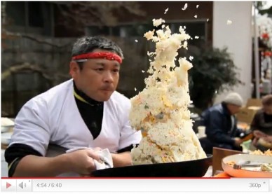 そんな中で見つけた面白動画が このチャーハンおじさん。37cmも ある大鍋を振って大量の焼き飯 を拵えます。匠の技というよりは、 見世物的荒業ですが、大真面目 にやっているところが実に好ましく、 テキヤさんとも違った玄人っぽさも好感が持てます。が・・・ 途中で味付けに塩コショウとともに大量の化学調味料を ふりかけるシーンがあり、それを見てしまうと、どうにも 食べてみたいという気にはなりません。暇な方は下の リンクから覗いてみてください。