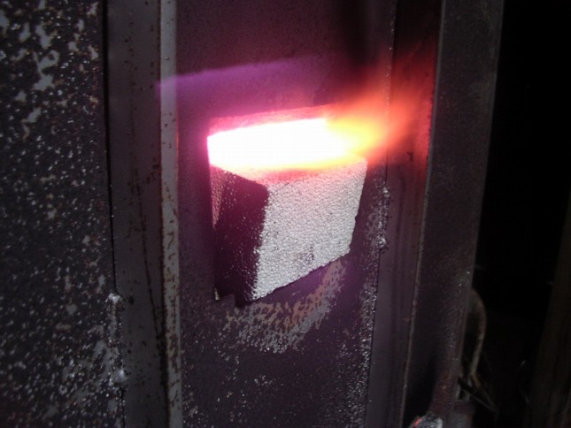 窯のフタ中央部にある 『色見』 還元焼成の炎が小気味良く噴いています。