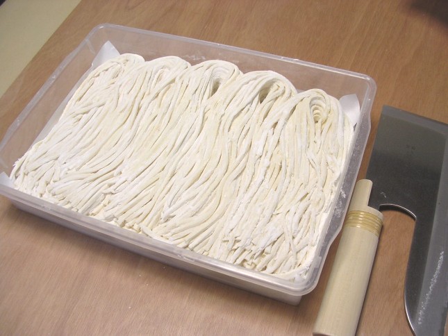 打ちたてのおうどん。包丁が ちーっとわざとらしい感じですねぇ。