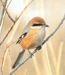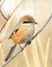 頭でっかちでくちばしが鋭いシル エットは遠くからでも良くわかり、 高いところにとまっては尾をくる くる回すしぐさは独特です。雄は 色合いもきれいで、滑空するよう に飛びながらキャキャキャキャと 連続して鳴く声でも、すぐにモズ だとわかります。百舌という名前 が付いたのは、多くの鳥の鳴き声を真似てぶつぶつ と小言を言うように鳴くからで、そんな声音の効いた 鳴き方を 『ぐぜり』 と呼びます。秋口に虫を木の枝 に刺し備蓄するような行動をしながらもその餌を食べ ることをしないので、物忘れの多い人をモズのようだ と揶揄することもあるそうです。この冬を乗り切って 春になれば、近場に巣をかけて繁殖をするのでしょう が、ホトトギスに託卵されてせっせと他の鳥のヒナを 育てる不運な境涯も待ち構えています。