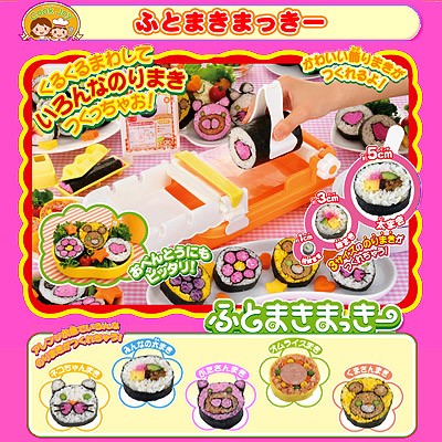 こちらがその太巻きメーカーその名も 『ふとまきまっきー』 ネーミングは実に ポップで愉快です。先に発売されて好評 を博した海苔巻きメーカー 『まきまきまっ きー』 の姉妹機種のようで、解説をよく 読んでみるとこの玩具実に楽しそうです。 5cm、3cm、1cmと3種類の太さが作れ、 カラフルな二重巻きや、動物の顔も作れ ちゃいます。惜しむらくは、長さが10cm止まりというところ、 恵方巻所謂 『丸かぶり寿司』 にはちと寸足らずですな。