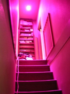 友人から、LED電球を貰いました。 節電が叫ばれている今日この頃です から、早速どこかに使おうと点けてみ たらこれが凄い色。一晩中点けっ放し の外灯がいいだろうと点けてみたら、 それはそれは恐ろしいホラーハウスの ようで、ご近所に迷惑をかけては済ま ないのでやめ、階段に採用しました。 今までは蛍光灯電球で点くまでにしばらく時間がかかって いましたがLEDはパッと点灯して明るく、それでいて3Wと いう低電力。実に質実剛健でグーなのですが、この赤紫色 はいかんともしがたいものがあります。今我が家の階段は 『怪談』 という字を当てたくなるような状態です。