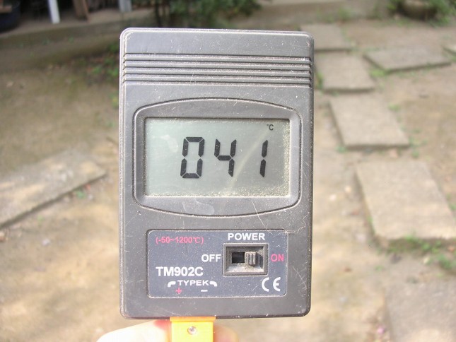 石窯用デジタル温度計での気温計測 熱電対ですから少々過敏な温度指示です。 百葉箱なら、35℃前後でしょうね。