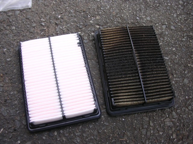 この車はエンジンが後ろにあって 荷室のカバーをパカリと開けると エンジンルームがすっかり見えます。 今日はエアクリーナーのエレメント を交換しました。 真っ黒でした! 点検記録簿なんて付いてない車で すから驚くほどのことは無いのですが、これほどとは思い ませんでした。