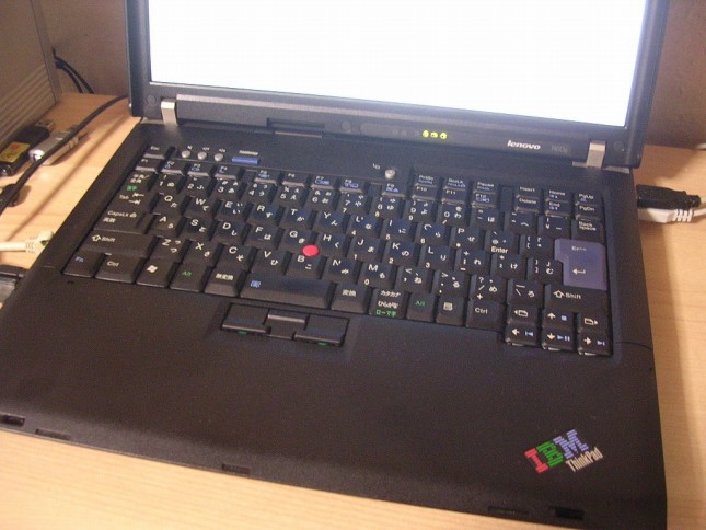 今は製造が Lenovo という チャイナのメーカに変わってし まいましたが、IBMのロゴもしっ かり入っています。ThinkPadと いえばやはりキーボード中央 の赤いお臍 『トラックポイント』 がその象徴でしょうか、これを使えばキーボードから 手を離さなくてもポインタを動かせます。慣れると パッド式よりも使い勝手が良いです。旧型の中古で すからモニターの幅が狭く、明るさも物足りないで すが、やはりサクサクと動作して、今まで使って いたソフトが淀みなく使えることが嬉しいです。
