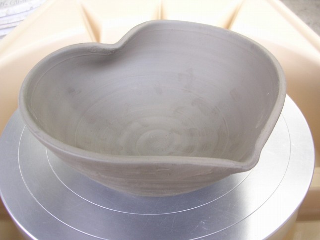 今年は磯子区の園で、女の子 からハートというお題をいただき、 丸い鉢を挽いておいて輪花鉢を 作るようにきゅきゅっとハート形 にして凌ぎました。すごーいと 純粋に喜ぶ子と、ずるーいと言い ながらもにこやかに眺める子がいて、インチキおじさん は笑いを堪えつつ、お子達の反応を楽しみました。 その後伺った二つの園でもこれを作りましたが、概ね 評判が良く、得意になって挽きました。本日、時間が 取れたので高台を削り、仕上げました。
