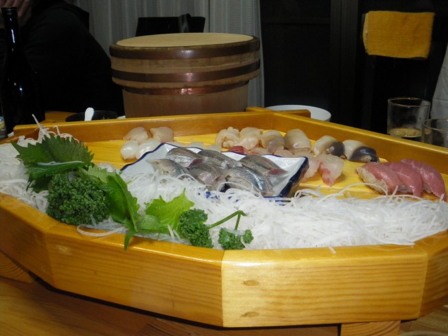 本日私はお寿司を担当します。 数年前から取り組んでいますが、 これが中々面白く、宴会のたび に見よう見真似で握っています。 画像は一昨年の11月に握ったも のです。人数が多かったので、 一貫が大きめですが、今日はコースの中の一品です ので一皿五貫付けというお献立、江戸前に品良く小さく 作ろうと思います。魚匠安藤師の足を引っ張らないよう に緊張して取り組みます。因みに本日の料理お献立は、 前菜・鯛と季節野菜のサラダ・小田巻き蒸し・お造り・ 大ブリの照り焼き・寿司・お椀物・そばがき善哉 です。